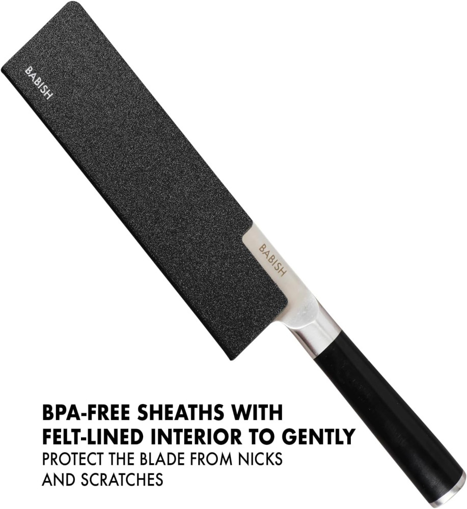 Set includes one 8-inch chef's knife with sheath, one 8-inch bread knife with sheath, one 8-inch carving knife with sheath, one 7.5-inch clef knife with sheath, one 6.5-inch santoku knife with sheath, one 5-inch utility knife with sheath, and one 3.5-inch paring knife with sheath